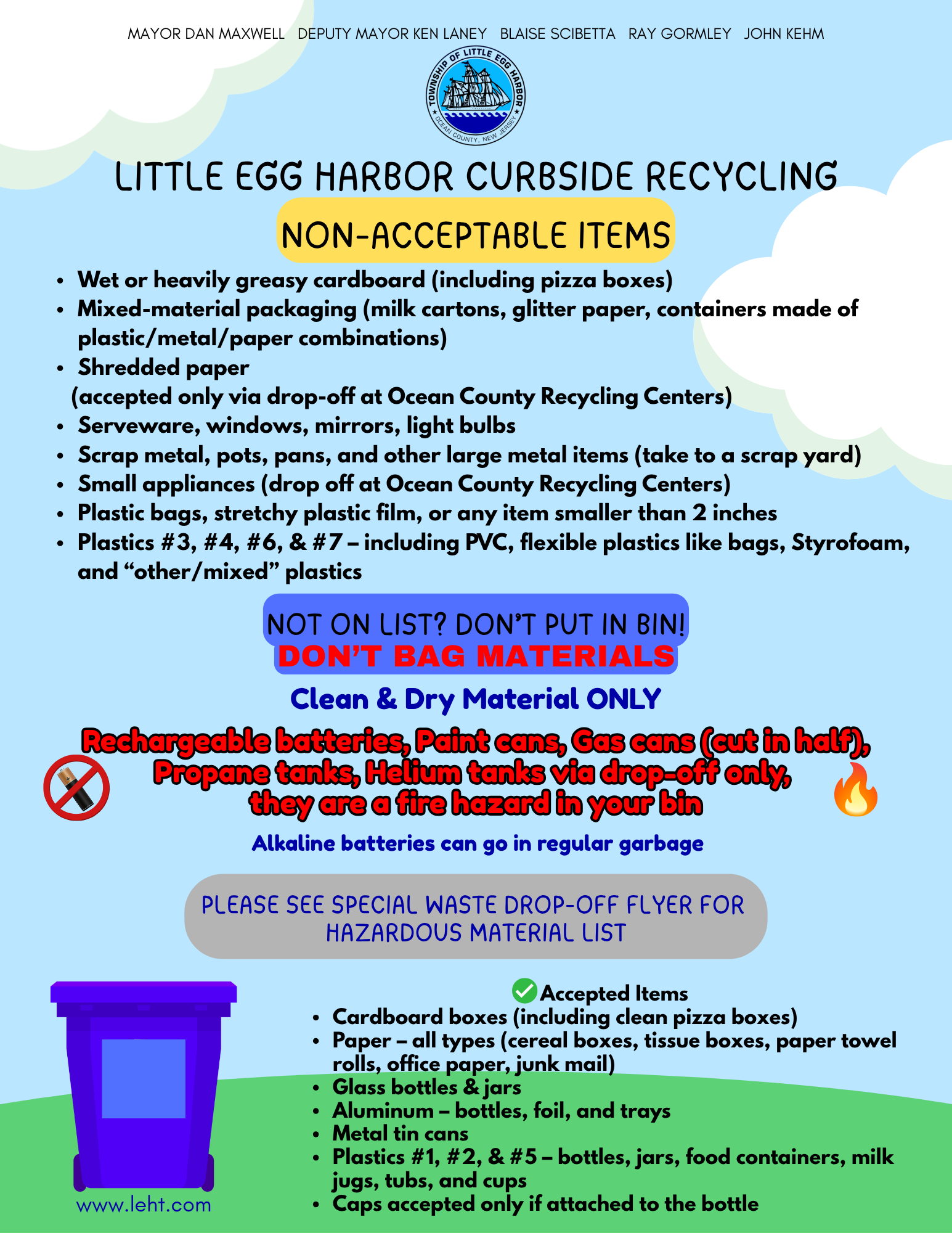 *PER THE RULES AND REGULATIONS OF THE TOWNSHIP, THE DPW RECYCLING CENTER IS FOR THE USE OF LITTLE EGG HARBOR TOWNSHIP RESIDENTS ONLY AND IT IS REQUIRED TO PROVIDE PROPER ID AND PROOF OF ADDRESS BEFORE ENTERING THE CENTER.